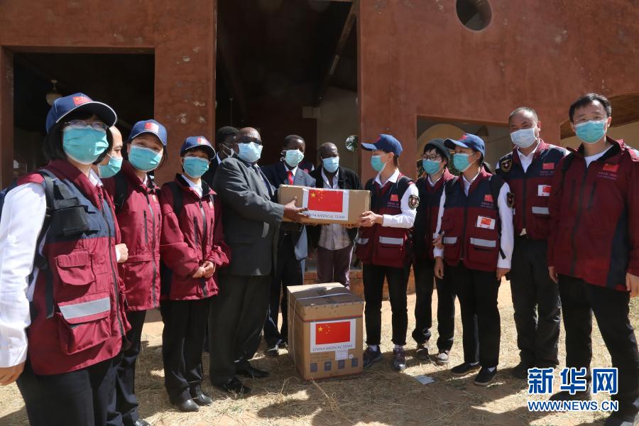 5月19日,在津巴布韋中馬紹納蘭省的姆武爾維醫(yī)院,中國(guó)抗疫醫(yī)療專(zhuān)家組為當(dāng)?shù)蒯t(yī)療機(jī)構(gòu)捐贈(zèng)醫(yī)療物資。新華社記者 張玉亮 攝