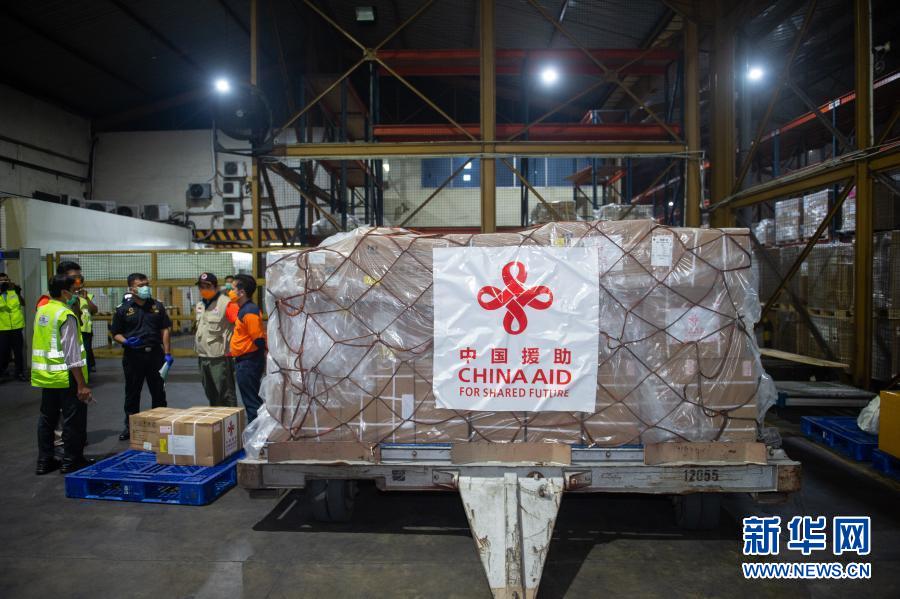 3月26日,中國(guó)援助印度尼西亞的首批抗疫物資停放在雅加達(dá)蘇加諾哈達(dá)機(jī)場(chǎng)倉(cāng)庫(kù)。新華社記者 杜宇 攝