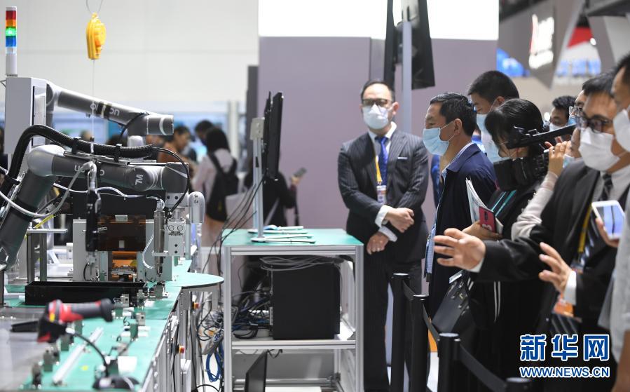 2020年11月6日,在進博會技術裝備展區(qū),人們在西門子展臺觀看人機協(xié)作的智能化單元生產線。新華社記者 李任滋 攝