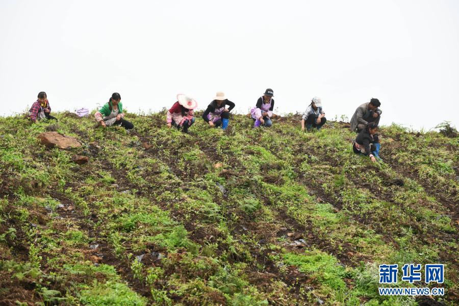 農民在貴州省普安縣地瓜鎮(zhèn)屯上村的“扶貧茶園”里給茶苗除草(2019年7月7日攝)。當地的茶園栽種有浙江安吉黃杜村捐贈的白茶苗。新華社記者 楊文斌 攝