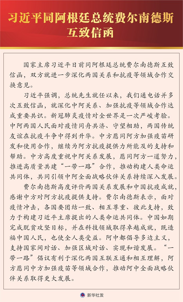 國家主席習近平日前同阿根廷總統(tǒng)費爾南德斯互致信函,雙方就進一步深化兩國關系和抗疫等領域合作交換意見。