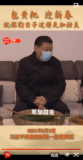 在苗族村民趙玉學(xué)家,習(xí)近平同一家人圍坐客廳,邊聊家常邊制作當(dāng)?shù)貍鹘y(tǒng)節(jié)日食品黃粑??倳?shū)記親手用粽葉裹著糯米、黃豆面包好一個(gè)黃粑,微笑著說(shuō):“我包過(guò)大粽子,這么小的沒(méi)有。很好很好,(祝你們今后的)日子過(guò)得更加幸福、更加甜美!”