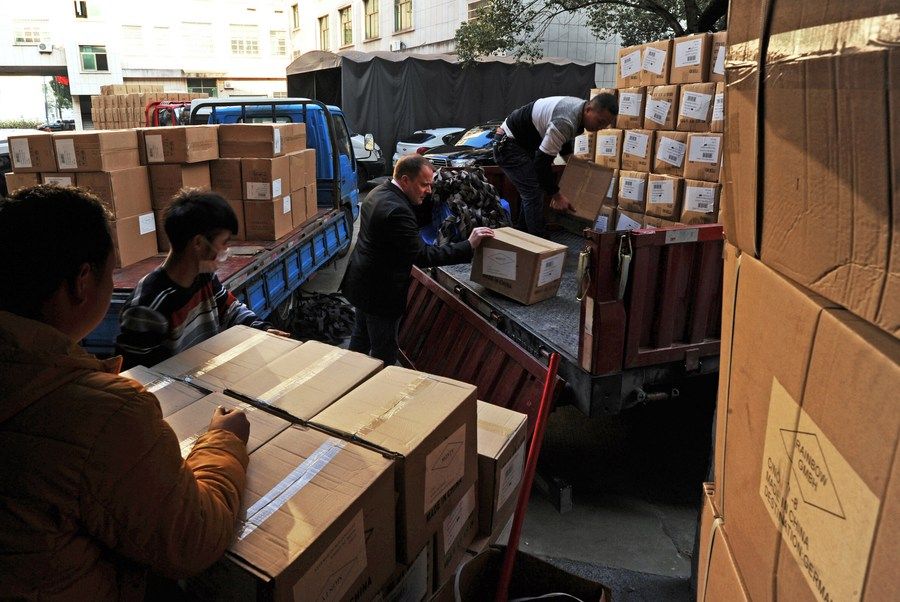 2019年11月28日,英國(guó)人奈杰爾(右二)在公司倉(cāng)庫(kù)查驗(yàn)一批出口貨物。 2005年初,奈杰爾來(lái)到浙江省義烏市國(guó)際商貿(mào)城,為這里的經(jīng)營(yíng)戶培訓(xùn)英語(yǔ)。2014年11月以來(lái),中歐班列(義烏)相繼開通了11條線路。自此,奈杰爾的進(jìn)出口生意也有了新通道。新華社記者 譚進(jìn) 攝