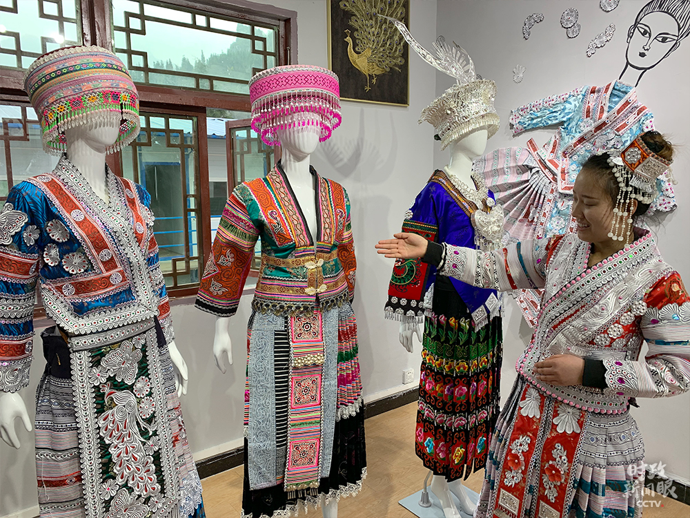 △楊文麗正在介紹“歪梳苗服飾”。(總臺(tái)央視記者段德文拍攝)