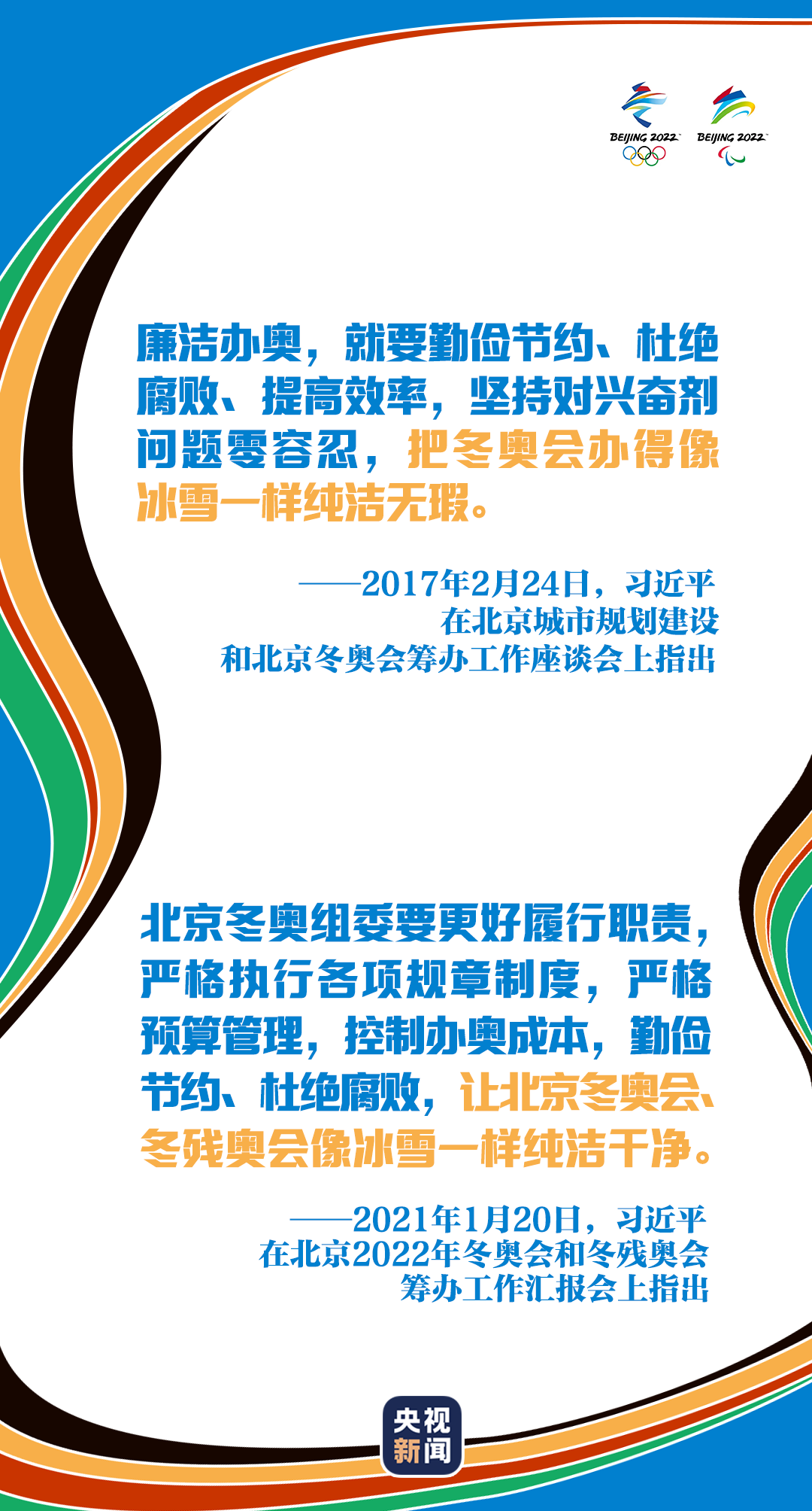 “堅(jiān)持廉潔辦奧,嚴(yán)格預(yù)算管理,控制辦奧成本,強(qiáng)化過程監(jiān)督,讓冬奧會(huì)像冰雪一樣純潔干凈。”