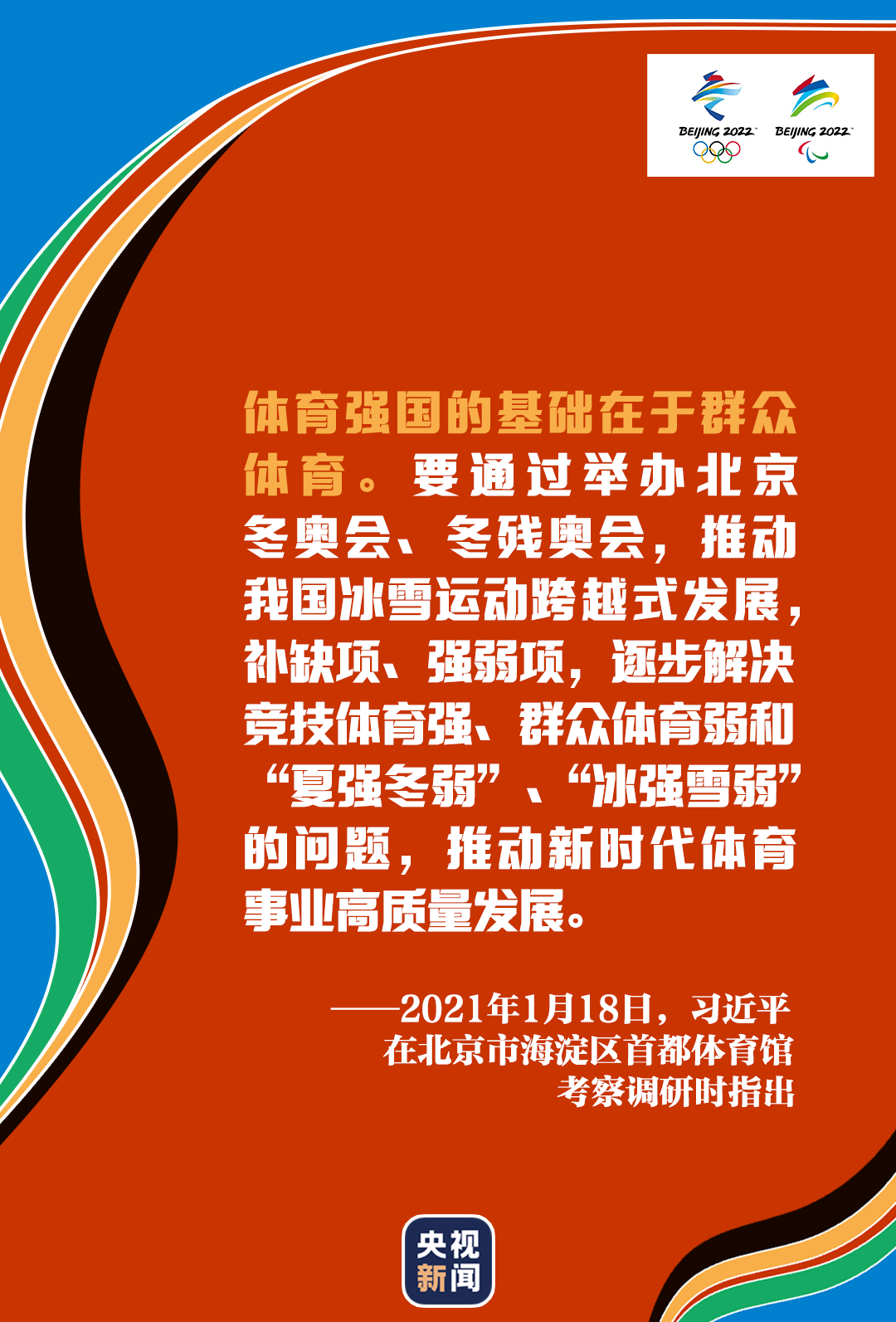 半個(gè)多月前,習(xí)近平總書記冒著嚴(yán)寒先后來到海淀、延慶、張家口等地,深入體育場館、訓(xùn)練基地、交通樞紐等,實(shí)地了解北京2022年冬奧會(huì)、冬殘奧會(huì)籌辦情況。