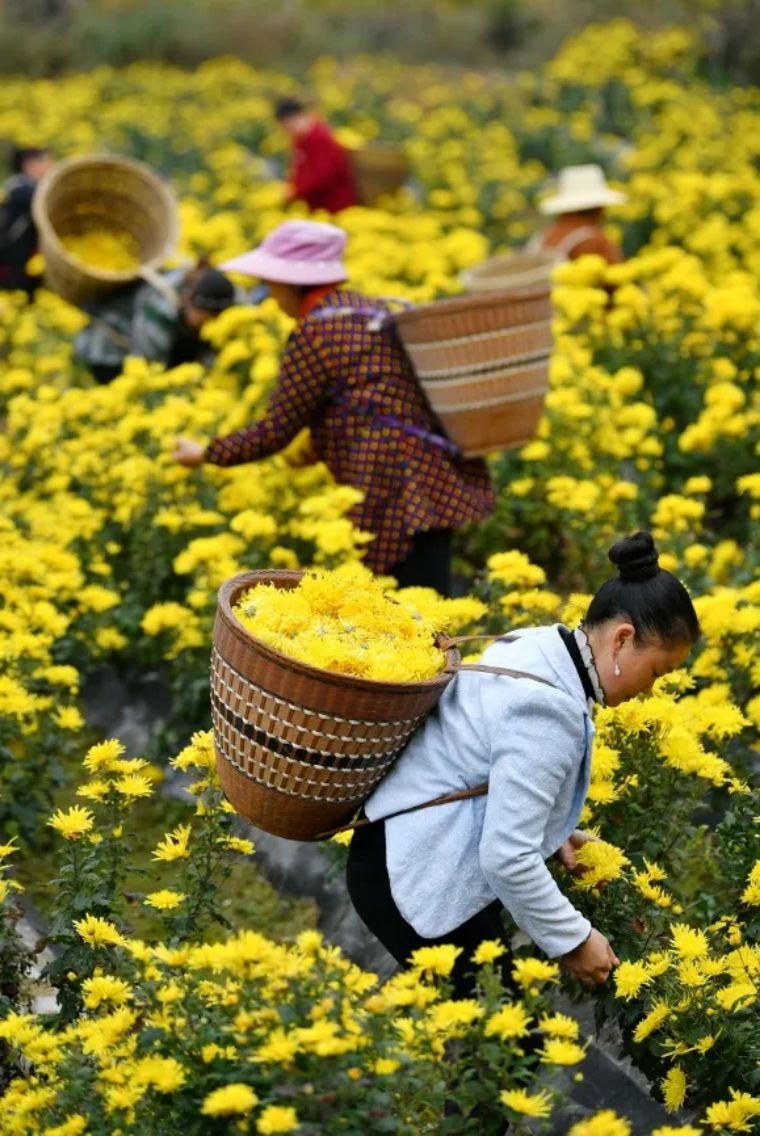 ↑2020年10月29日,湖北省恩施土家族苗族自治州宣恩縣曉關(guān)侗族鄉(xiāng)黃草壩村農(nóng)民在采摘金絲皇菊。在當(dāng)?shù)囟弊迦罕娋劬訁^(qū),農(nóng)民們在駐村扶貧工作隊的引導(dǎo)下積極種植金絲皇菊。“合作社+基地+農(nóng)戶”的種植模式提高了農(nóng)民抵御市場風(fēng)險的能力,激發(fā)了農(nóng)民耕作土地的積極性,促進(jìn)深山侗族群眾脫貧增收。