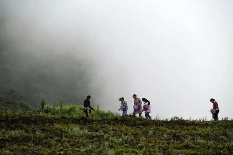↑2019年7月7日,農(nóng)民在貴州省普安縣地瓜鎮(zhèn)屯上村的“扶貧茶園”里給茶苗施肥。為幫助貧困地區(qū)群眾脫貧,2018年浙江安吉黃杜村將“白葉一號”白茶苗捐贈給貴州省普安縣、沿河土家族自治縣,湖南省古丈縣,四川省青川縣等3省4縣,覆蓋貧困戶1862戶。