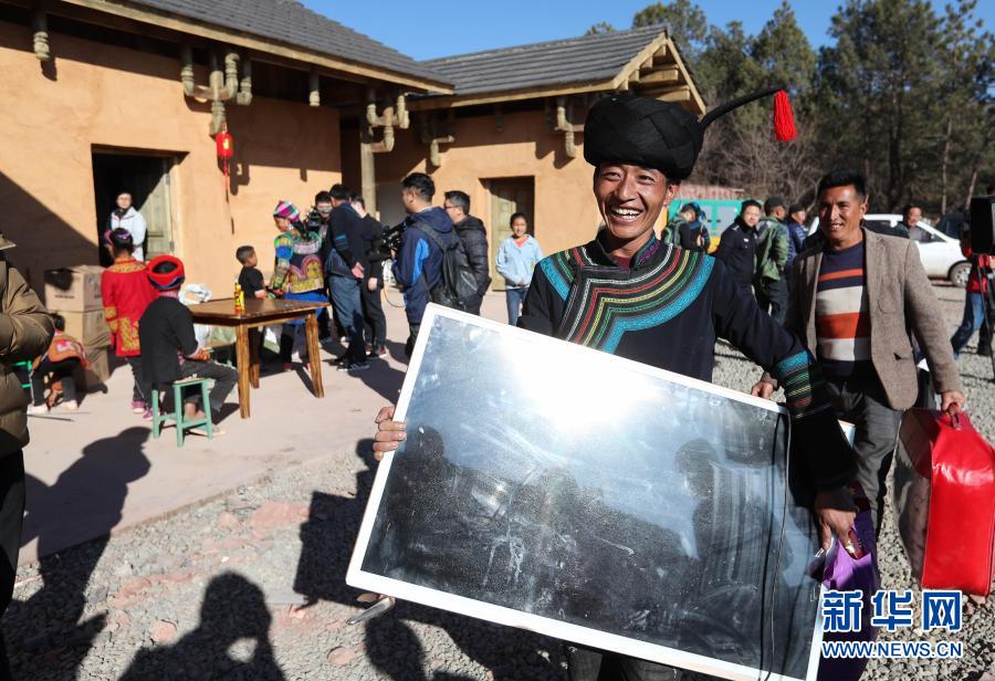 在四川省昭覺(jué)縣三河村的易地扶貧安置點(diǎn),彝族群眾馬海日聰喜搬新居(2019年2月11日攝)。2019年2月11日,位于大涼山腹地的四川省昭覺(jué)縣三河村首批29戶、168人告別居住多年的土坯房,搬入易地扶貧安置點(diǎn)的新家。新華社記者 江宏景 攝