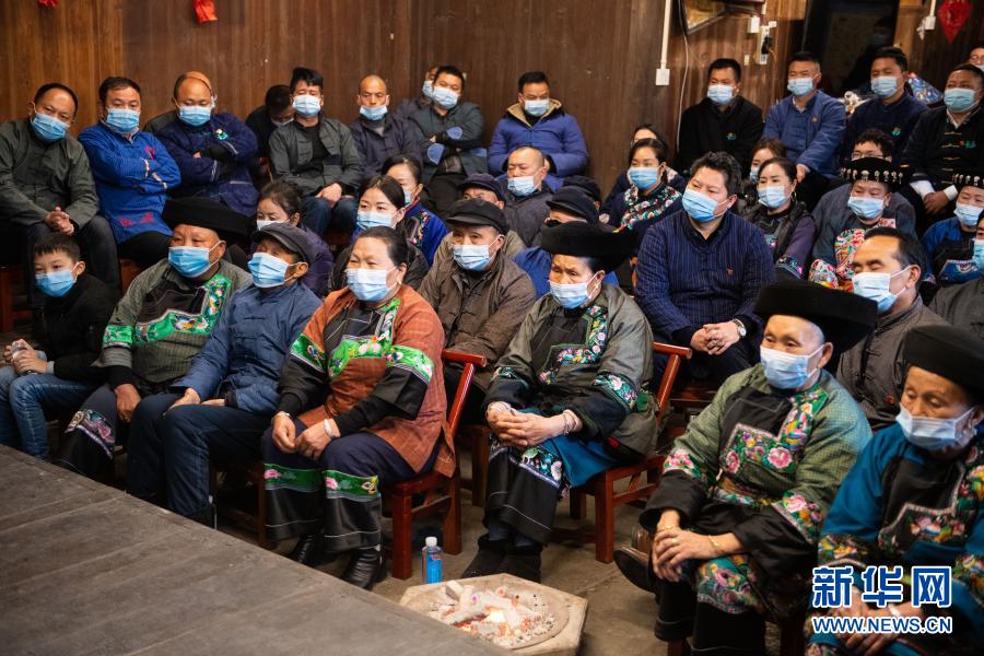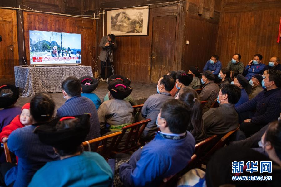 2月25日上午,在湖南省湘西土家族苗族自治州花垣縣十八洞村,當?shù)馗刹俊⑷罕娫谝粦舸迕窦沂湛慈珖撠毠钥偨Y表彰大會直播。新華社記者 陳思汗 攝