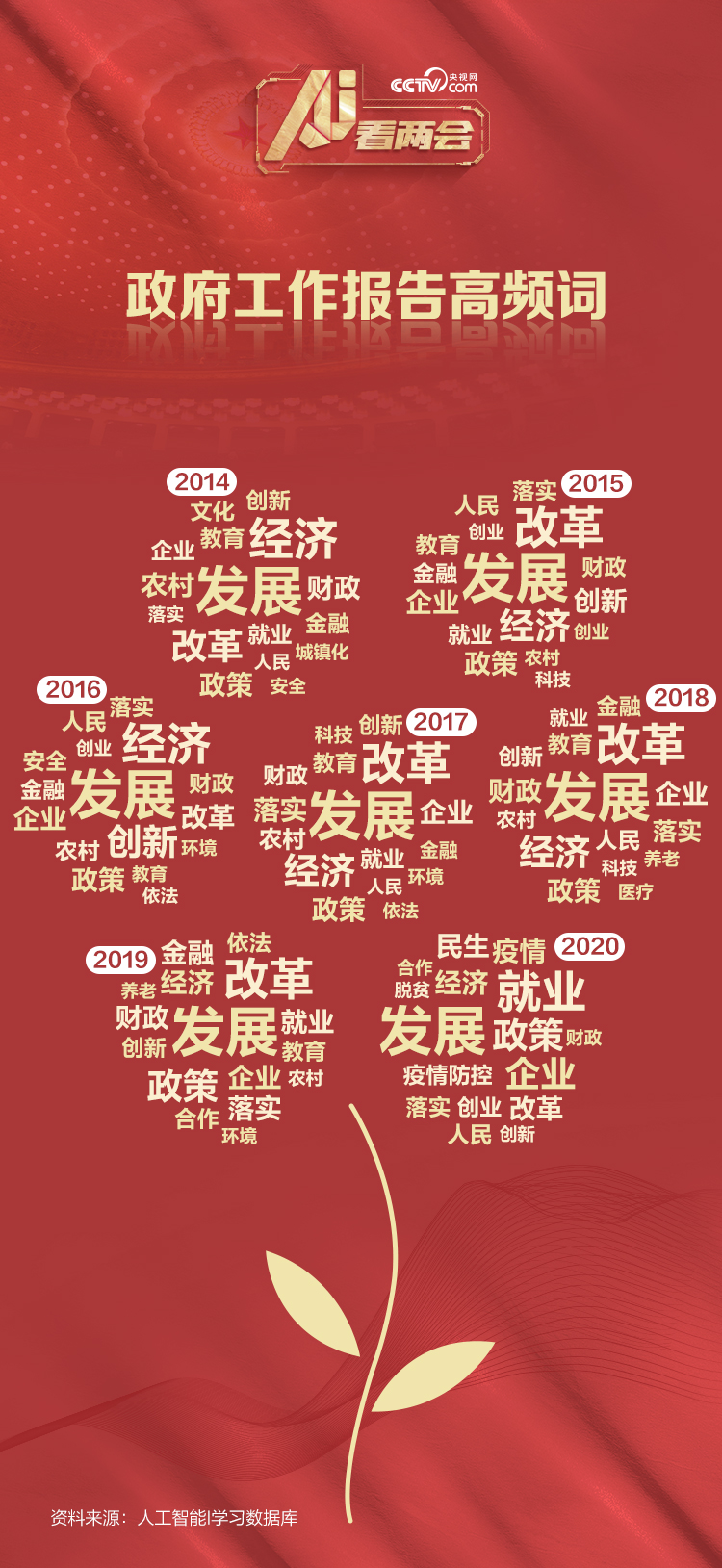 依托人工智能I學(xué)習(xí)數(shù)據(jù)庫,央視網(wǎng)人工智能編輯部還分析了2014年以來每一份政府工作報告的高頻詞。