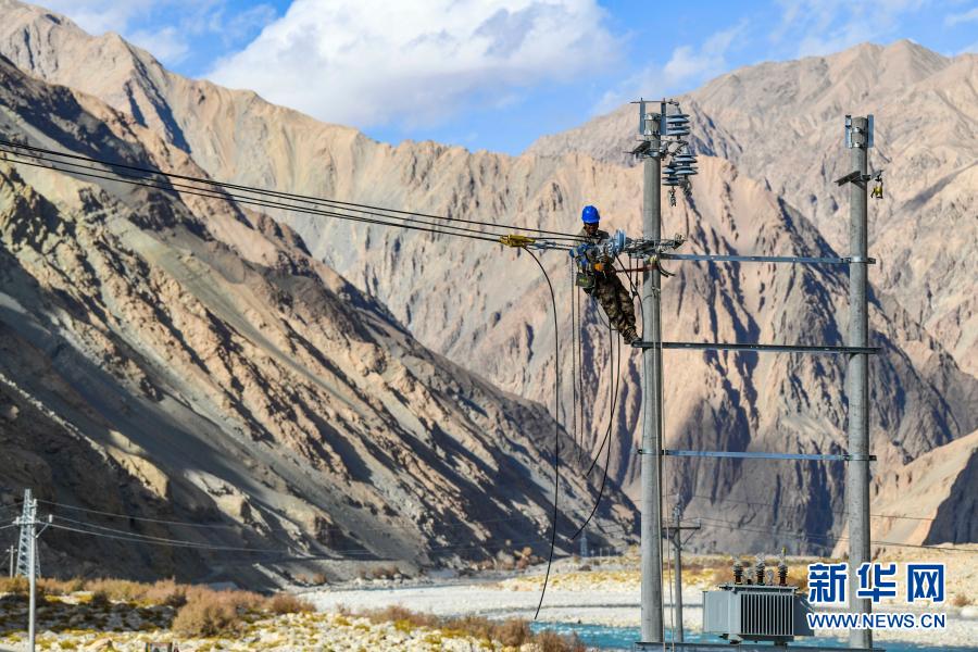 在新疆塔什庫爾干塔吉克自治縣的深山中,工人在調(diào)節(jié)一處入戶線路的松緊度(2019年11月23日攝)。為了解決供電難題,新疆加大投入,實施光伏供電村電網(wǎng)延伸工程,惠及偏遠(yuǎn)村莊。 新華社記者 胡虎虎 攝