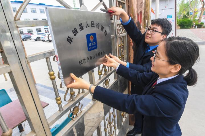 2019年4月23日,河北省阜城縣人民檢察院檢察官在一家企業(yè)門口掛“民營企業(yè)法律服務(wù)站”的牌子,為經(jīng)濟(jì)發(fā)展履行保駕護(hù)航職責(zé)。新華社記者李曉果攝