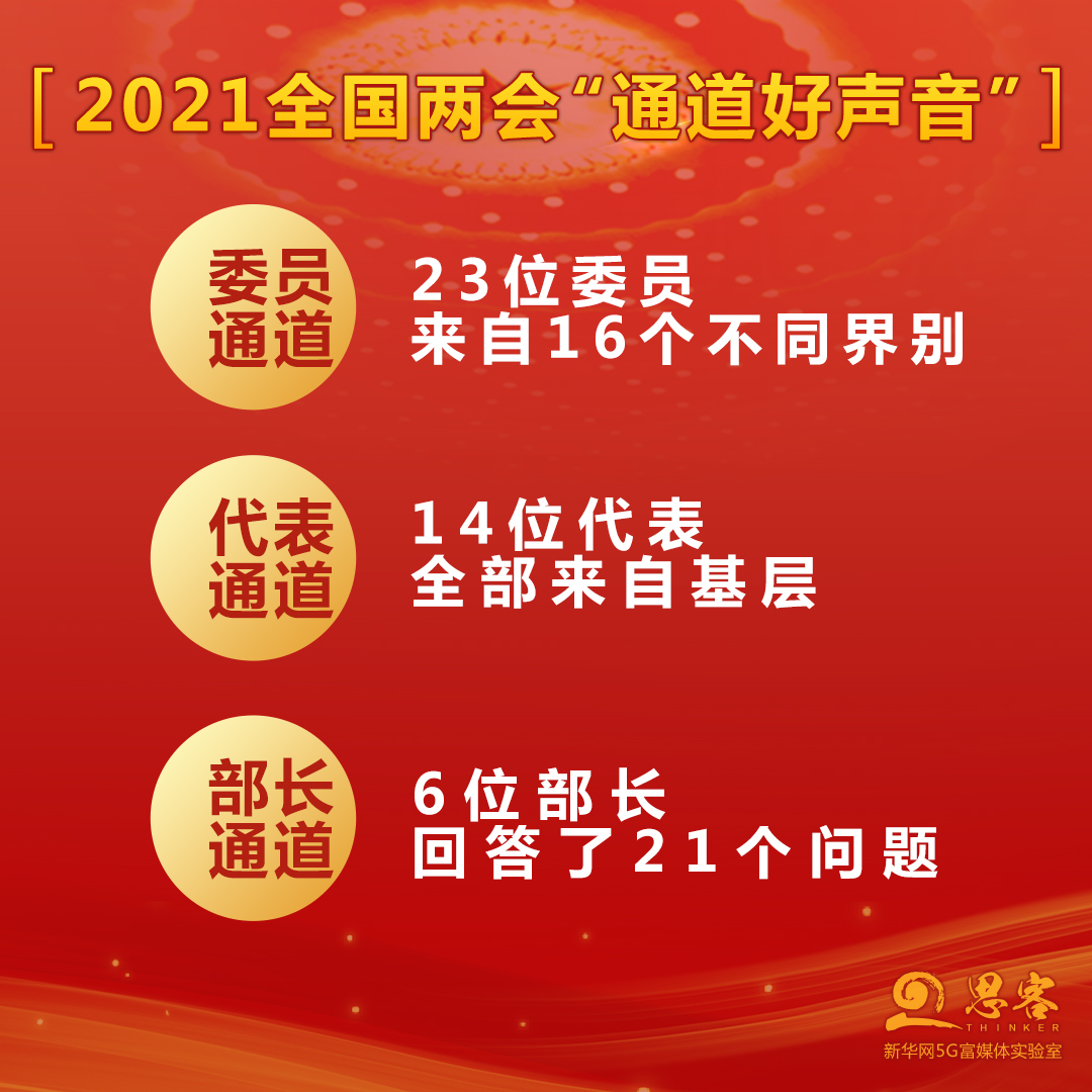 3月11日,2021年全國兩會(huì)圓滿落下帷幕。會(huì)議期間共舉行了2場(chǎng)“代表通道”、3場(chǎng)“委員通道”、2場(chǎng)“部長通道”。今年的7場(chǎng)“通道”受到網(wǎng)民留言點(diǎn)贊,“回答很有意思,故事里有深意”“不避熱點(diǎn)難題,回答讓人解渴”“務(wù)實(shí)、誠懇、有態(tài)度”“滿滿的自信,中國未來更給力”……