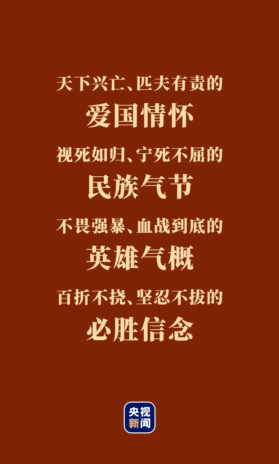鑒往事,知來(lái)者。繼承和弘揚(yáng)偉大抗戰(zhàn)精神,以越是艱險(xiǎn)越向前的大無(wú)畏氣概,奮勇搏擊、迎難而上、勇于斗爭(zhēng),我們必將在戰(zhàn)勝各種風(fēng)險(xiǎn)挑戰(zhàn)中書(shū)寫(xiě)中華民族偉大復(fù)興的新篇章。