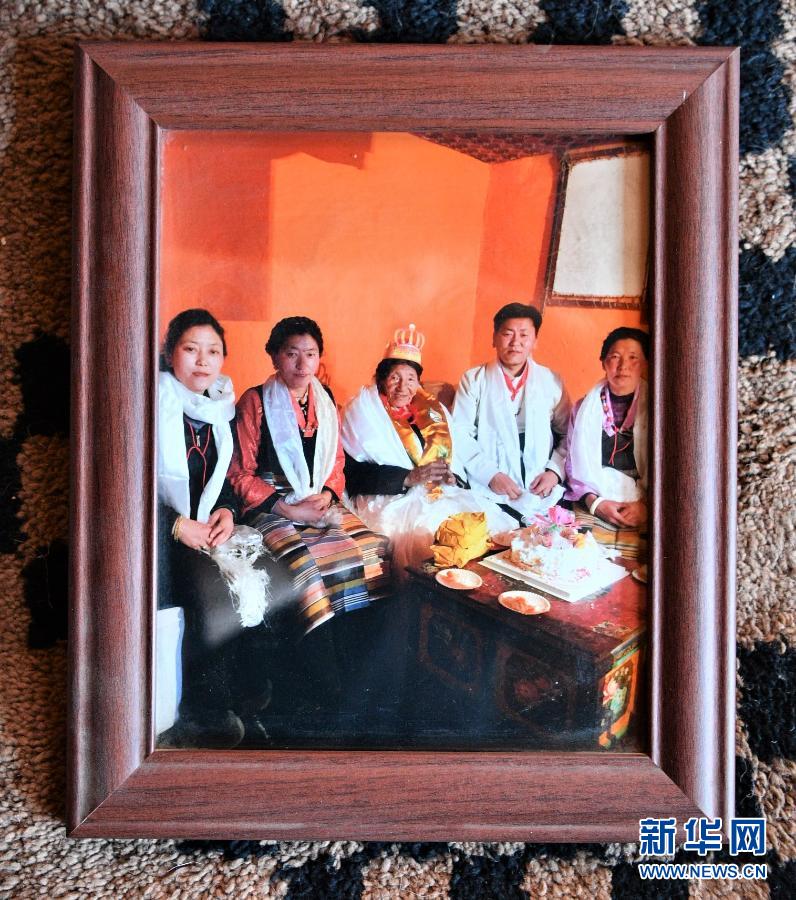 這是家里懸掛的巴桑老人過生日的照片(2月27日攝)。新華社記者 孫非 攝