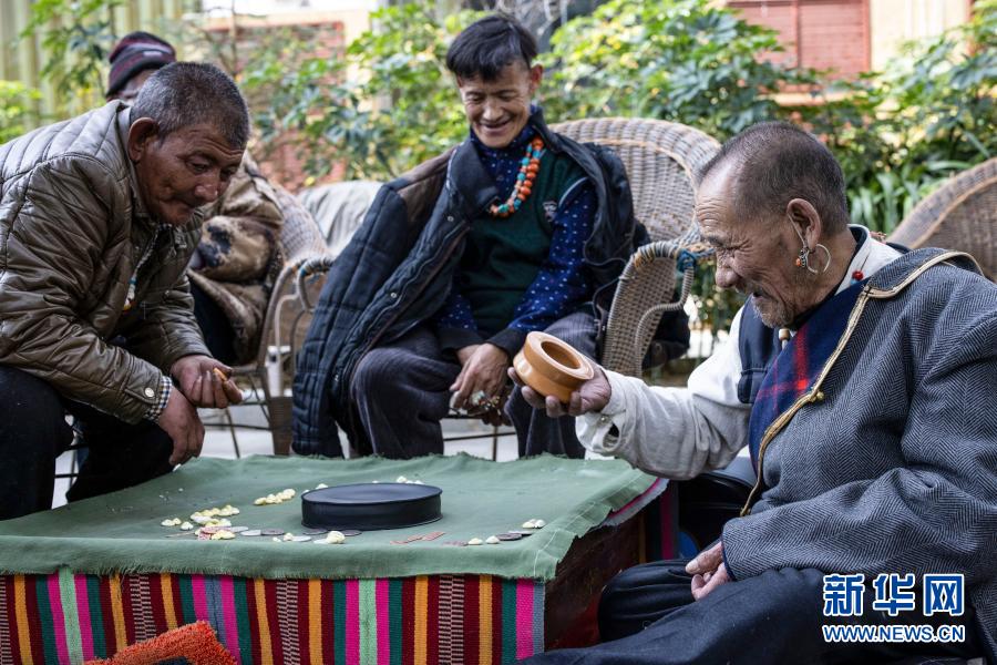 次旦(右)在集中供養(yǎng)服務中心和朋友們一起進行娛樂活動(3月19日攝)。