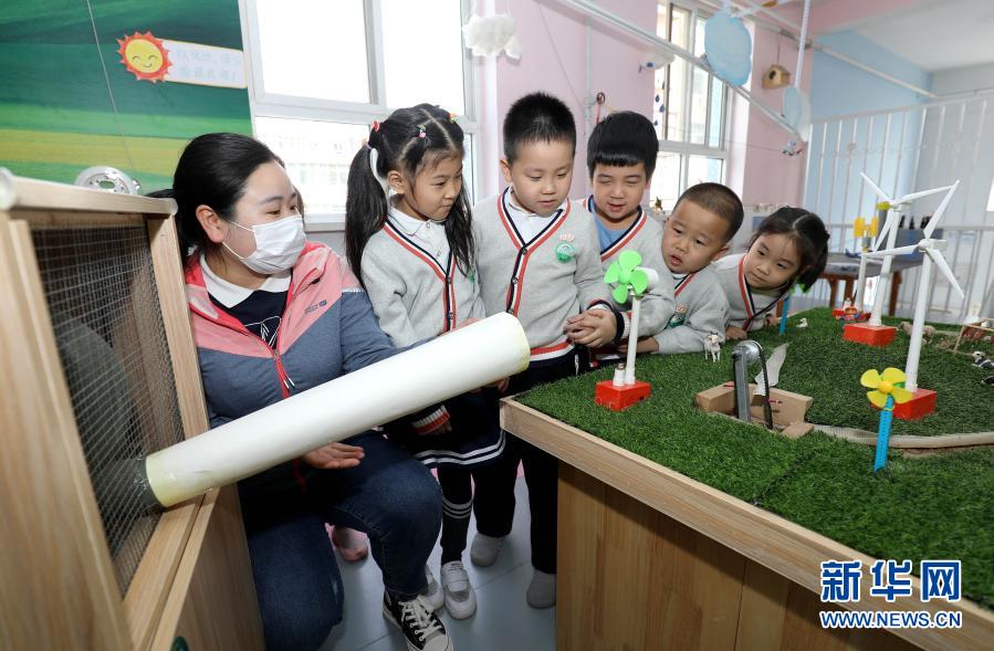 3月22日,在河北省石家莊市橋西區(qū)瑞特幼兒園,老師通過(guò)“風(fēng)的超能力”科普實(shí)驗(yàn),讓孩子們感受風(fēng)能的作用。新華社發(fā)(梁子棟 攝)