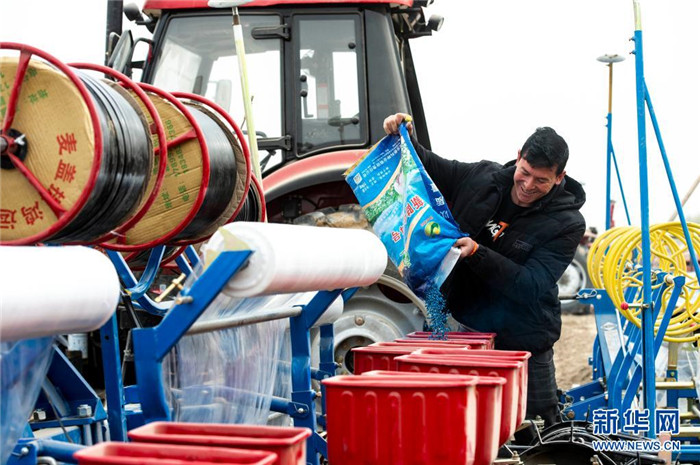 在新疆喀什地區(qū)莎車縣,阿卜杜薩力·阿伍提往播種機里倒棉籽(3月26日攝)。新華社記者 馬鍇 攝
