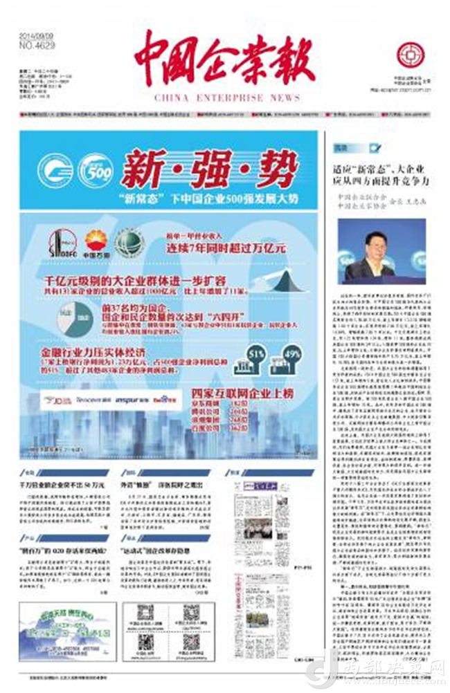 《中國企業(yè)報》是由中國企業(yè)聯(lián)合會、中國企業(yè)家協(xié)會主管主辦,是中國唯一以企業(yè)和企業(yè)家為報道核心的中央級媒體?!吨袊髽I(yè)報》是一張專為中國企業(yè)創(chuàng)辦的報紙。1988年1月4日,由國家經(jīng)委主辦,中國企業(yè)管理協(xié)會承辦的《中國企業(yè)報》正式創(chuàng)刊。陳云同志為報紙題寫了報頭,鄧力群任報社名譽顧問,袁寶華任報社名譽社長。從1988年創(chuàng)辦至今,秉承“面向企業(yè),為企業(yè)服務(wù)”的辦報宗旨,親歷和記錄著中國企業(yè)的改革進程,同時伴隨著中國企業(yè)的發(fā)展壯大而不斷成長。經(jīng)過20多年的實踐探索,在報道企業(yè)新聞、推動企業(yè)改革、維護企業(yè)權(quán)益、促進企業(yè)發(fā)展等方面,逐步形成了自身的風(fēng)格和特色,專業(yè)性、權(quán)威性日益得到了企業(yè)界和新聞界的認同。