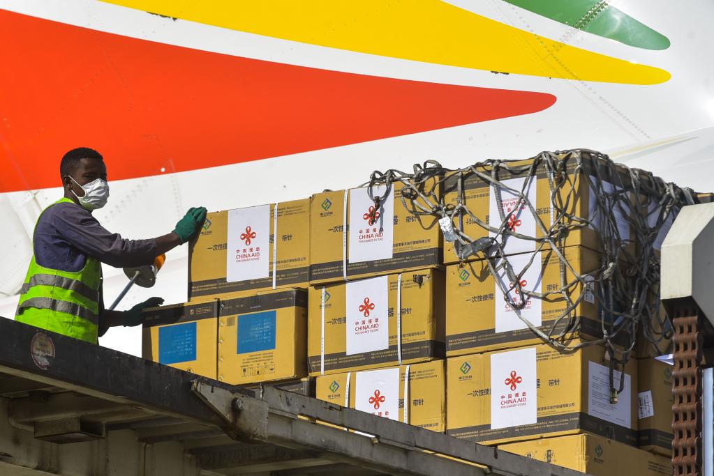 3月30日,工作人員在埃塞俄比亞亞的斯亞貝巴博萊國(guó)際機(jī)場(chǎng)卸載中國(guó)政府援助的疫苗。