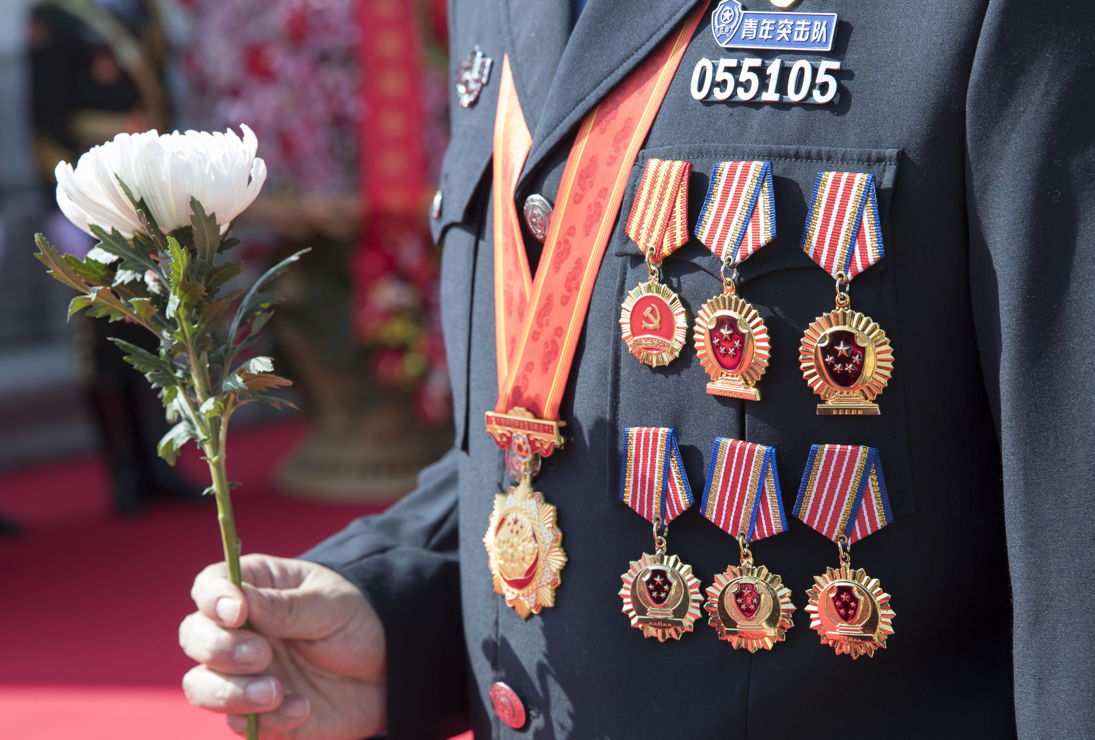 ↑2020年9月30日,在北京天安門廣場(chǎng)舉行的烈士紀(jì)念日向人民英雄敬獻(xiàn)花籃儀式上,一名公安干警手持白菊,寄托哀思。新華社記者 王曄 攝