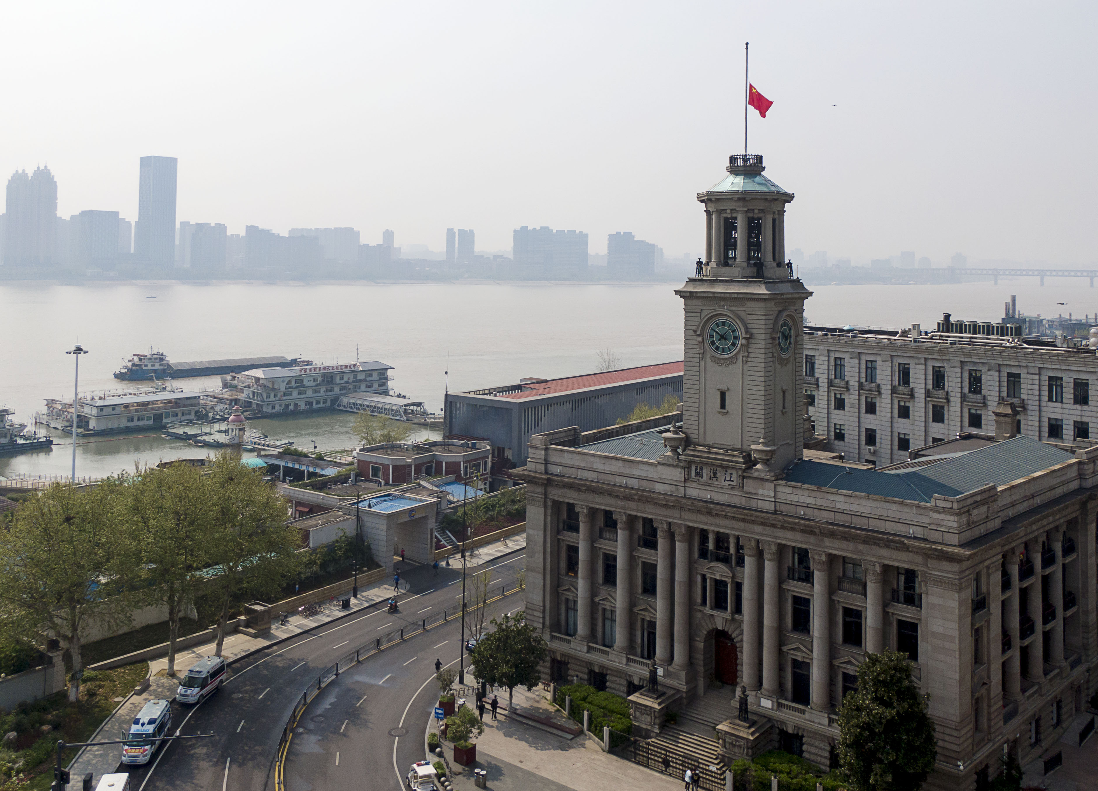 ↑2020年4月4日,武漢市舉行哀悼活動(dòng),表達(dá)對(duì)抗擊新冠肺炎疫情斗爭(zhēng)犧牲烈士和逝世同胞的深切哀悼。這是武漢江漢關(guān)大樓下半旗志哀。新華社記者 熊琦 攝