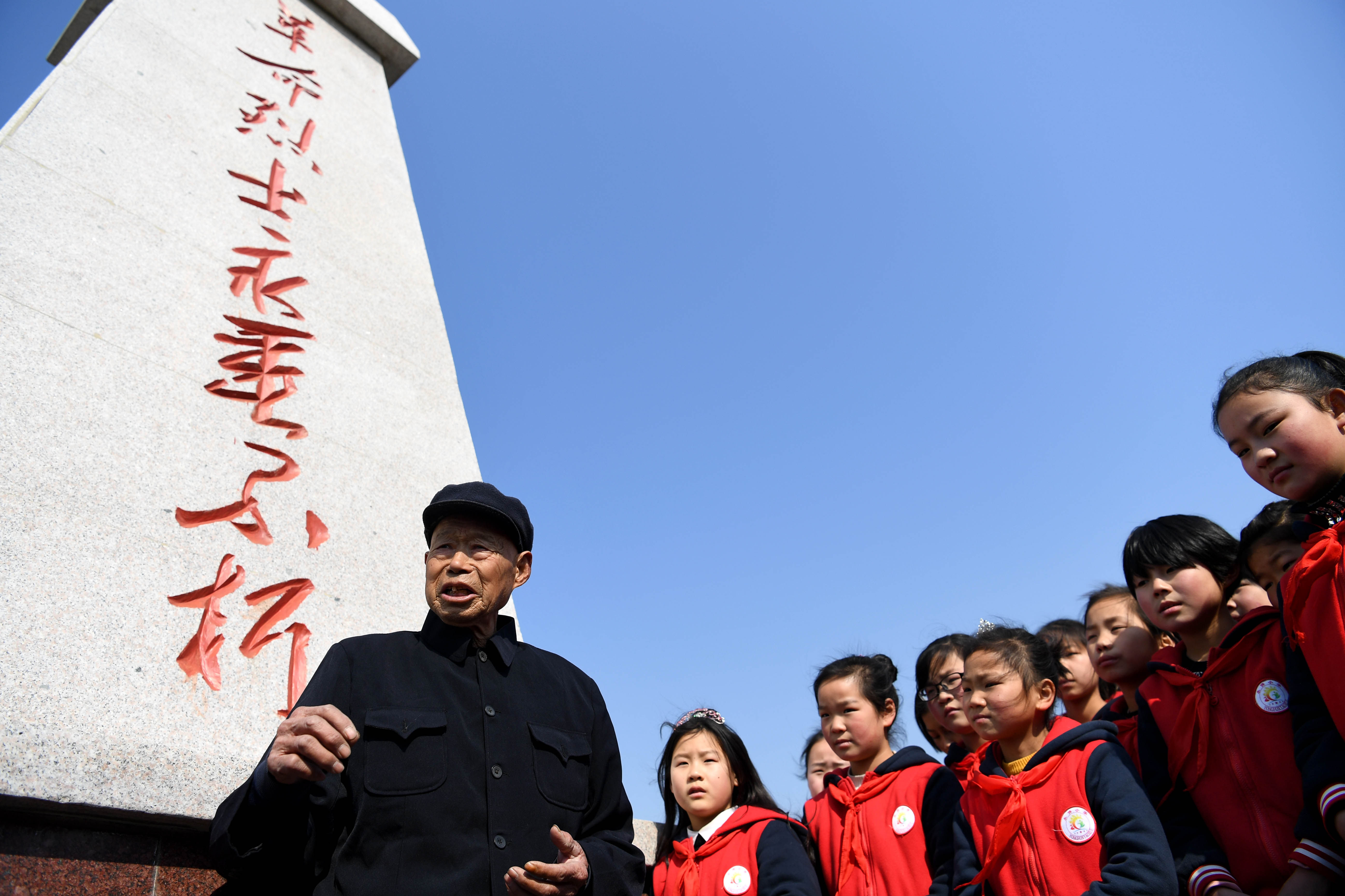 ↑今年89歲的胡兆倫是安徽省懷遠(yuǎn)縣陳集鎮(zhèn)胡劉烈士陵園管理員,70多年如一日為英烈們守墓。這是他在烈士陵園為前來(lái)掃墓的小學(xué)生講解烈士的事跡(2019年3月14日攝)。新華社記者劉軍喜攝