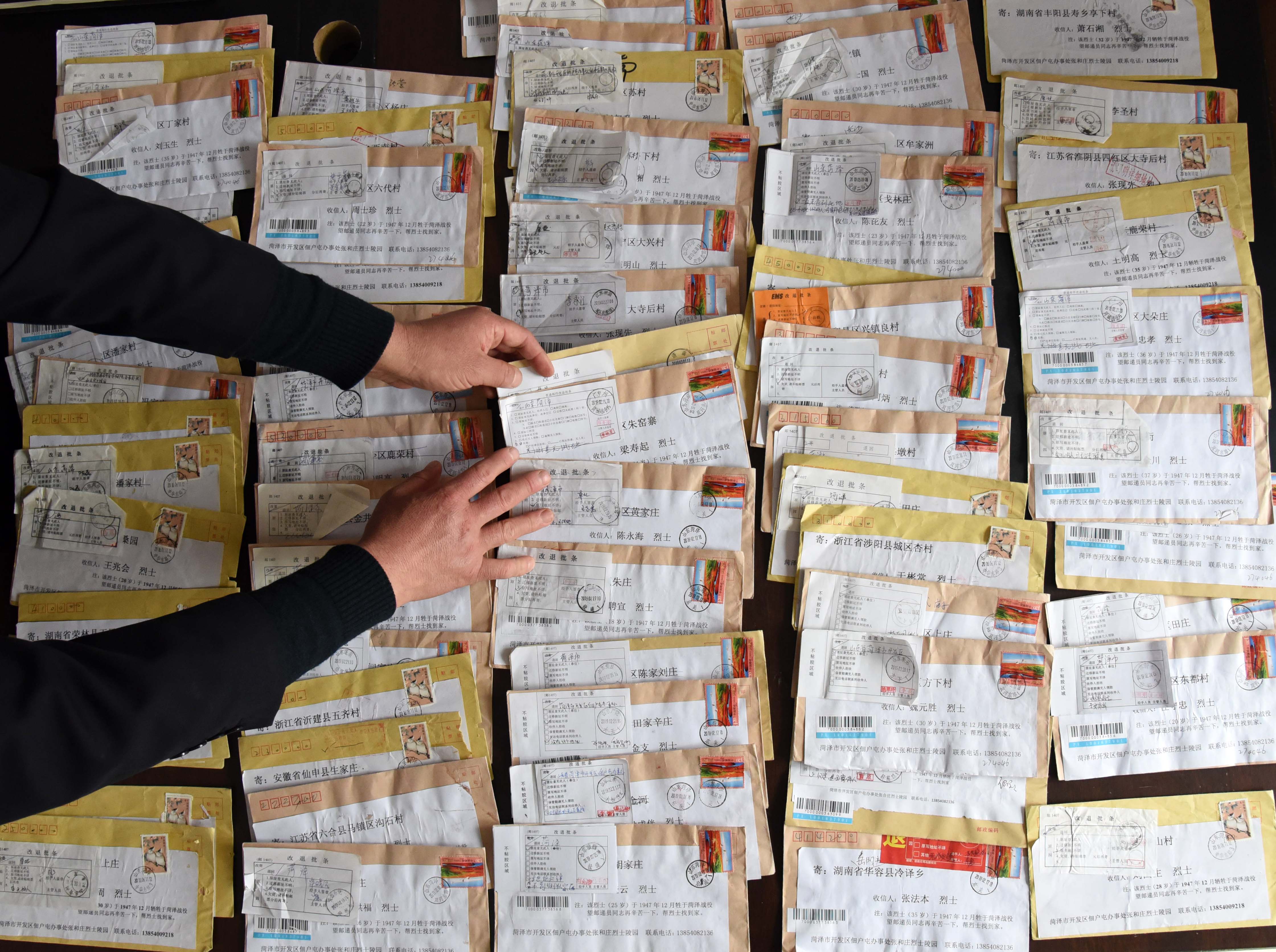 ↑2008年,時(shí)任山東省菏澤市張和莊村黨支部書記的張景憲決心為張和莊烈士陵園的無(wú)名烈士找到家鄉(xiāng)和親人,告慰他們的英靈。從2014年開始,張景憲按照先前尋訪到的資料地址,通過(guò)寄信等方式至今已為38位烈士找到親人。這是2019年3月20日,張景憲在整理多年來(lái)他收到的退信。新華社記者 王凱攝