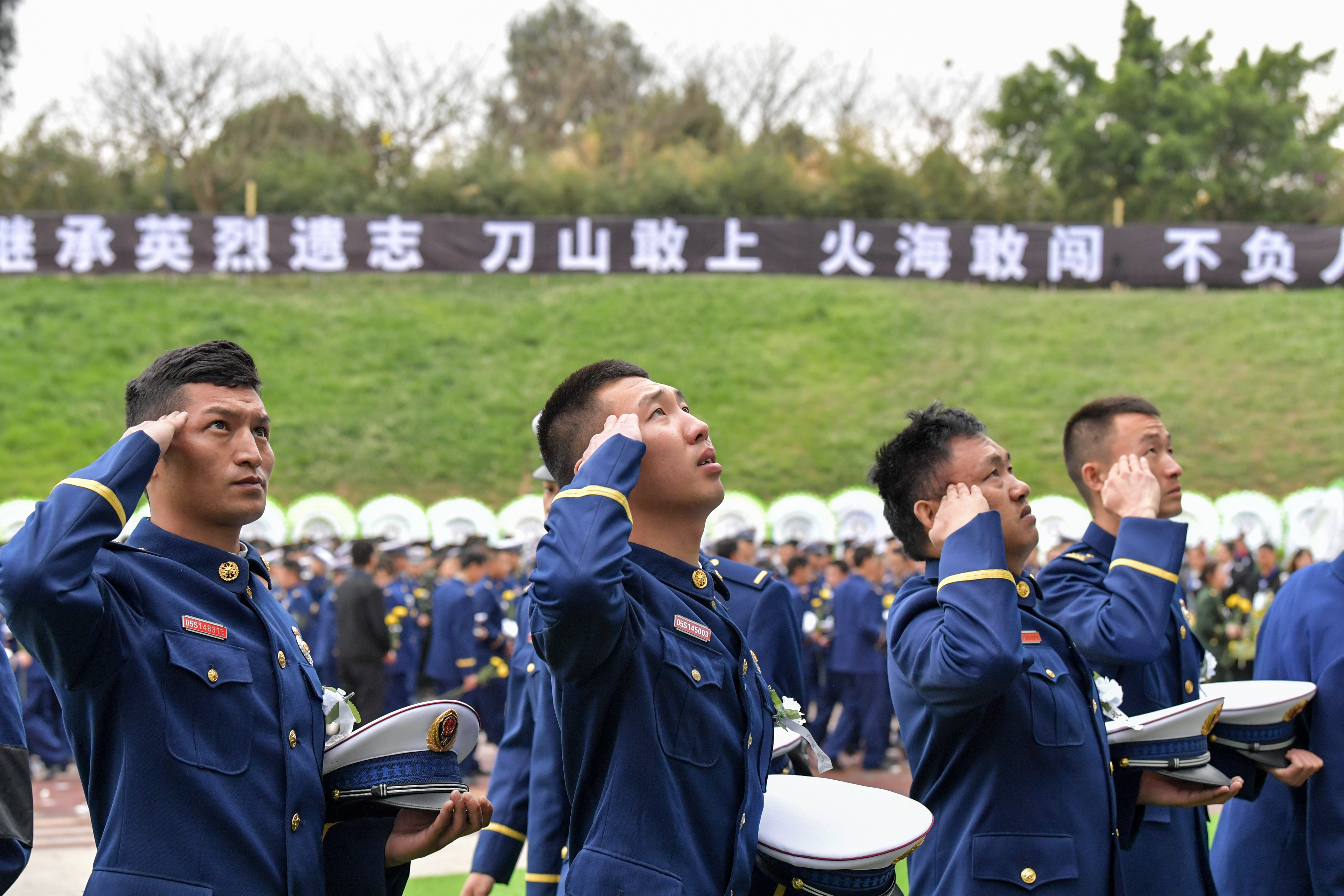 ↑2019年4月4日,參加四川木里森林火災(zāi)撲救中英勇犧牲烈士悼念活動(dòng)的森林消防官兵向犧牲的戰(zhàn)友敬禮。在這場(chǎng)火災(zāi)中,共有27名森林消防隊(duì)員犧牲。新華社記者 張超群 攝