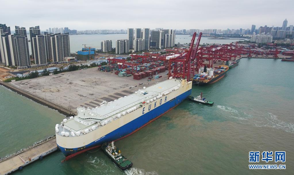 滾裝貨船“勞拉”輪駛?cè)牒?谛阌⒏邸_@是海南自貿(mào)區(qū)政策實(shí)施以來的首艘汽車外貿(mào)船(2020年2月16日攝,無人機(jī)照片)。新華社記者 楊冠宇 攝