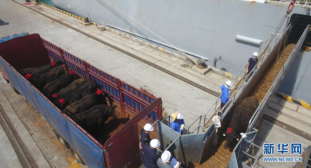 裝載來自澳大利亞的進(jìn)口活牛貨船抵達(dá)海南馬村港后,工作人員在接卸活牛(2020年7月3日攝,無人機(jī)照片)。新華社記者 楊冠宇 攝