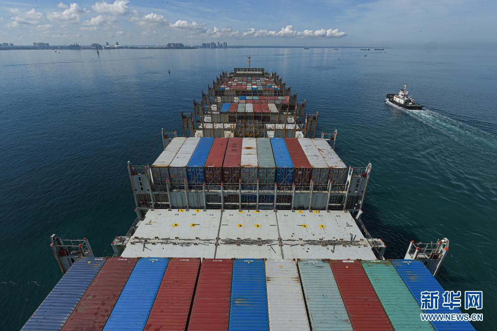 這是2020年9月23日拍攝的一艘行駛在海南洋浦港海域的集裝箱船。新華社記者 蒲曉旭 攝