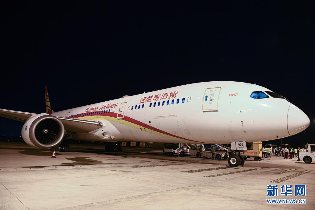 這是3月26日在海口美蘭國(guó)際機(jī)場(chǎng)拍攝的海南航空HU787航班。3月27日凌晨,該航班搭載貨物從??陲w往法國(guó)巴黎,海南自貿(mào)港首條定期洲際貨運(yùn)航線正式開通。新華社記者 蒲曉旭 攝
