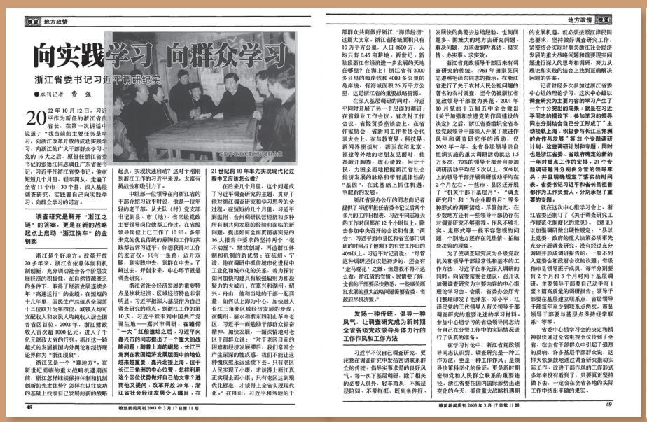 時任新華社浙江分社社長的費強,曾多次隨習近平參加基層調(diào)研。2003年3月17日第11期、2004年4月12日第15期《瞭望》先后刊發(fā)了費強采寫的深度報道《向?qū)嵺`學習 向群眾學習——浙江省委書記習近平調(diào)研紀實》《從“調(diào)研開局”到“調(diào)研開路”——中共浙江省委常委會求真務實紀實》。文章記錄了習近平同志任浙江省委書記期間,以特色鮮明的基層調(diào)研迅速打開工作局面的生動過程。