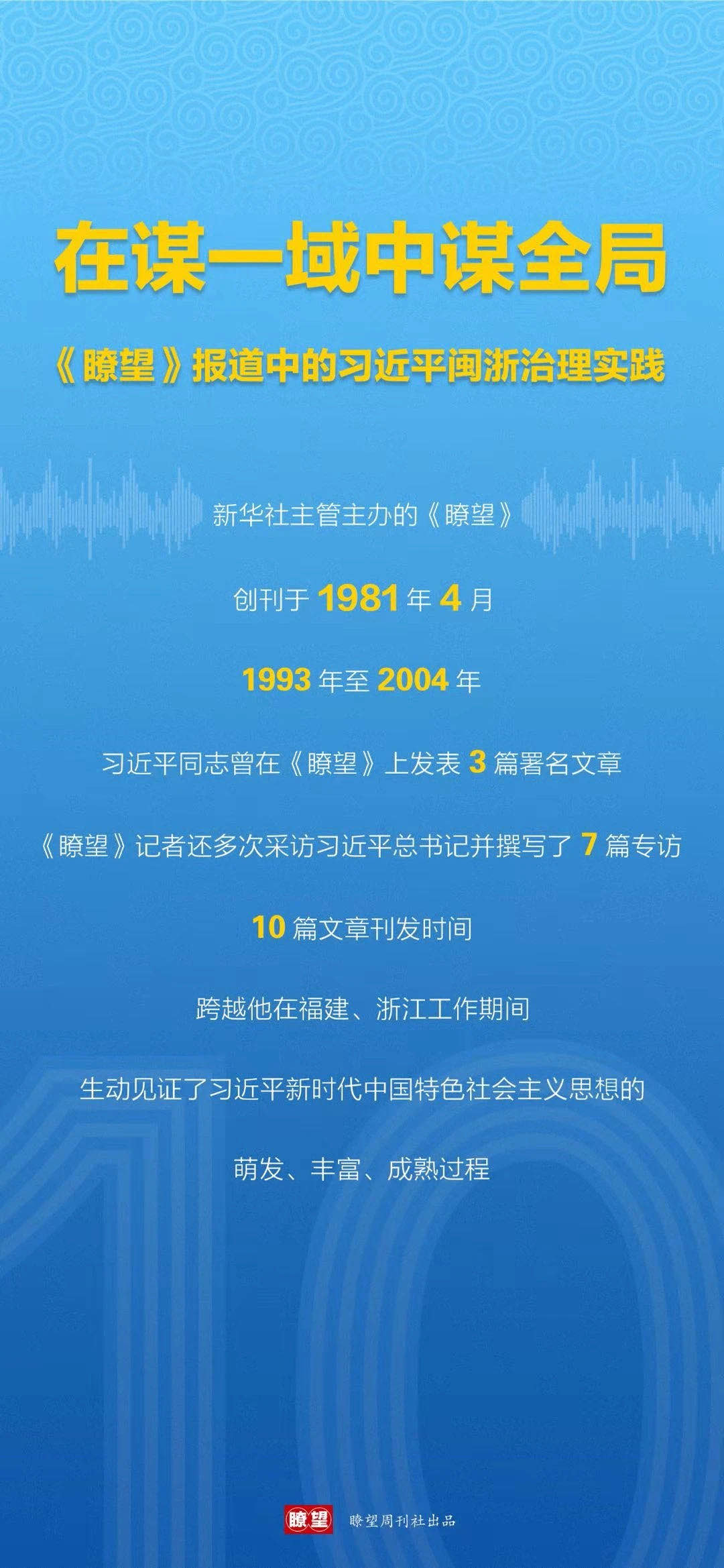 新華社主管主辦、創(chuàng)刊于1981年4月的《瞭望》,從1993年至2004年,曾先后10次專訪習近平同志或刊發(fā)他的署名文章,時間跨越他在福建、浙江工作期間,生動見證了習近平新時代中國特色社會主義思想的萌發(fā)、豐富、成熟過程。