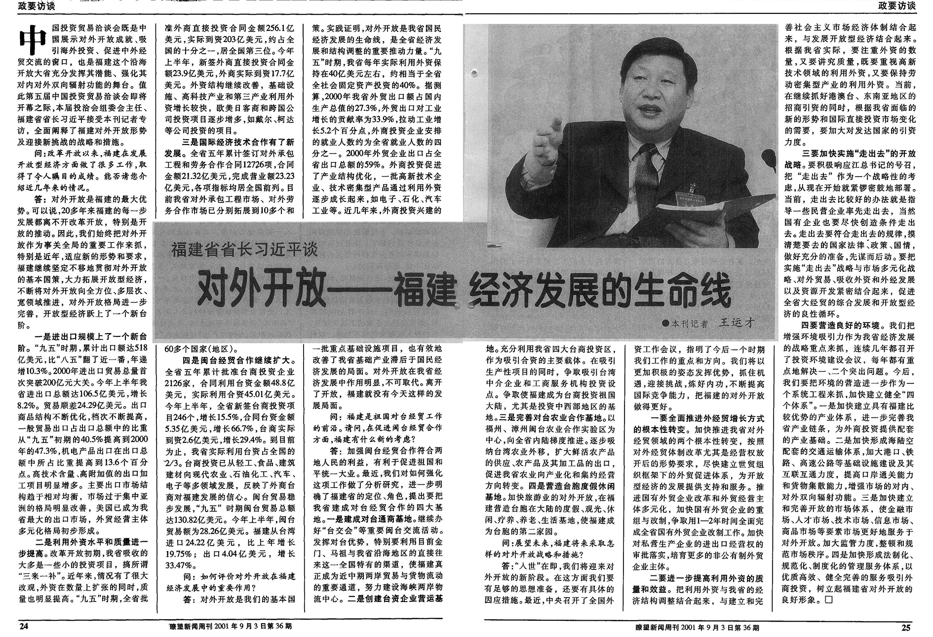 2001年9月3日,《瞭望》再次刊發(fā)專訪報道《福建省省長習近平談:對外開放——福建經(jīng)濟發(fā)展的生命線》。