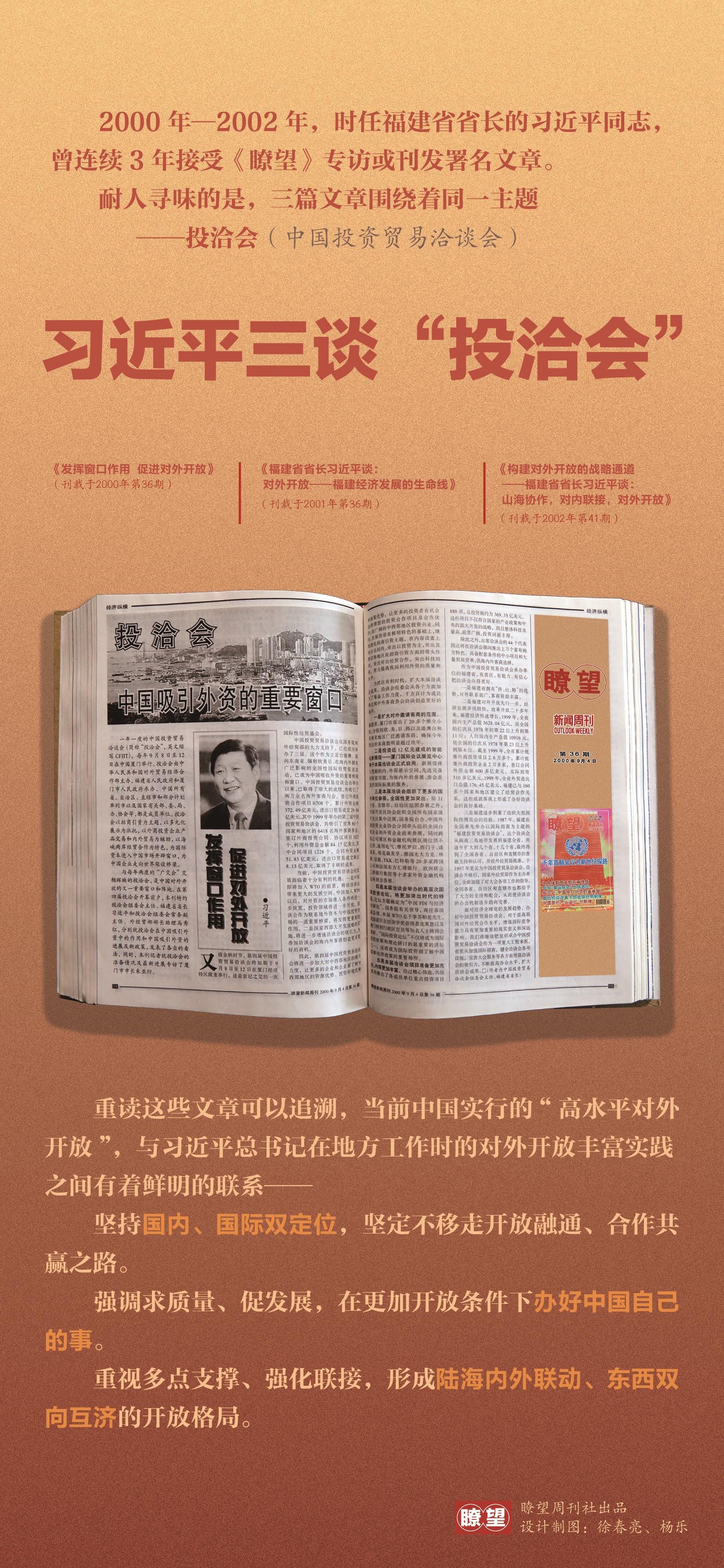 2002年10月14日,《瞭望》刊發(fā)專訪報道《構(gòu)建對外開放的戰(zhàn)略通道——福建省省長習近平談:山海協(xié)作,對內(nèi)聯(lián)接,對外開放》。文中,習近平由第六屆投洽會成果,談及福建進一步擴大對外開放的具體思路——著力構(gòu)建山海協(xié)作、對內(nèi)聯(lián)接、對外開放三條戰(zhàn)略通道。