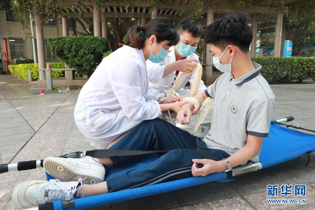 5月11日,在廈門大學(xué)附屬科技中學(xué)思明校區(qū),學(xué)校醫(yī)務(wù)人員在應(yīng)急救援演練中為一名“傷員”包扎傷口。新華社發(fā)(曾德猛 攝)