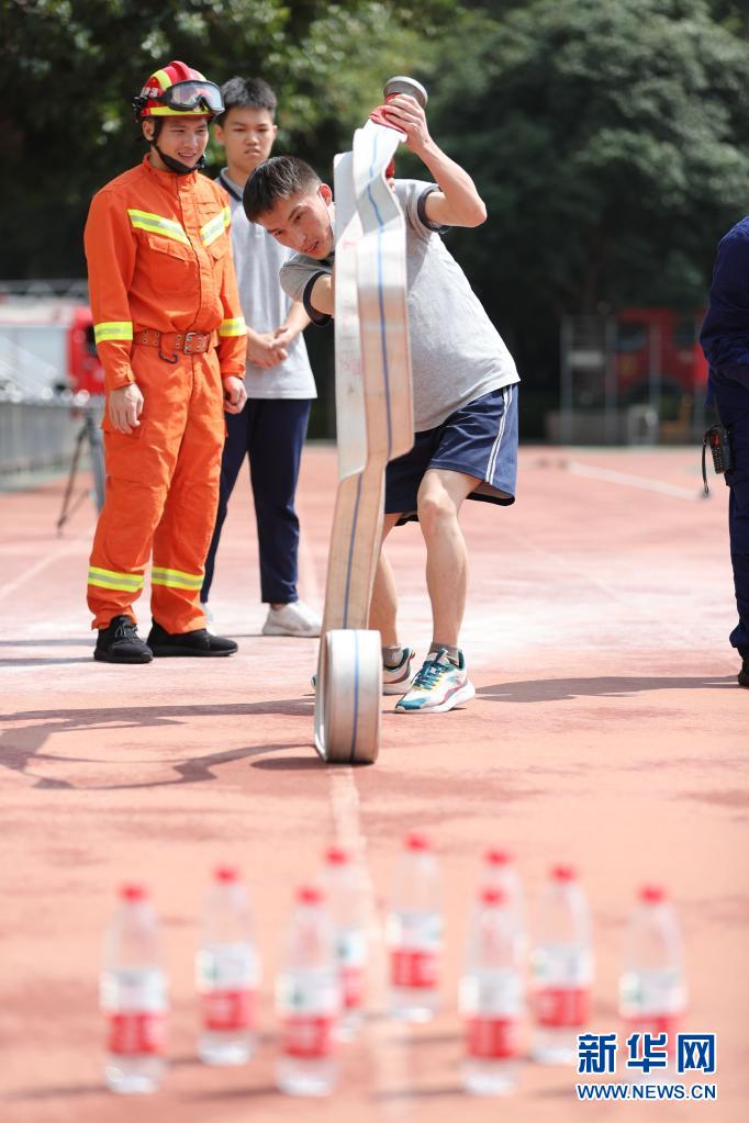 5月11日,在廈門大學(xué)附屬科技中學(xué)思明校區(qū),學(xué)生在消防員的指導(dǎo)下體驗(yàn)甩消防水帶。新華社發(fā)(曾德猛 攝)