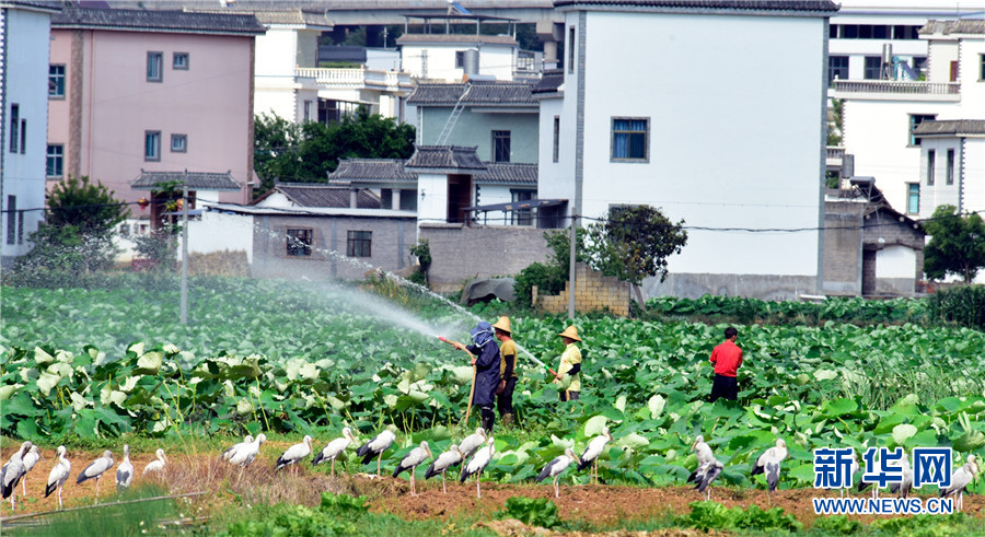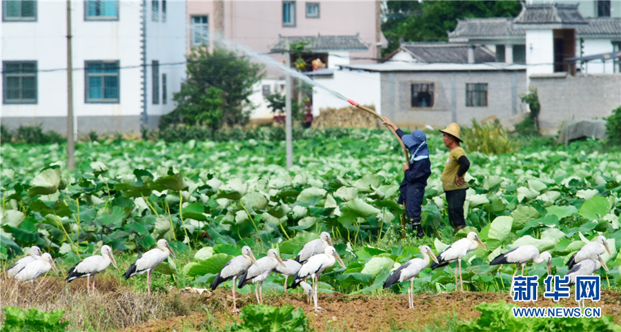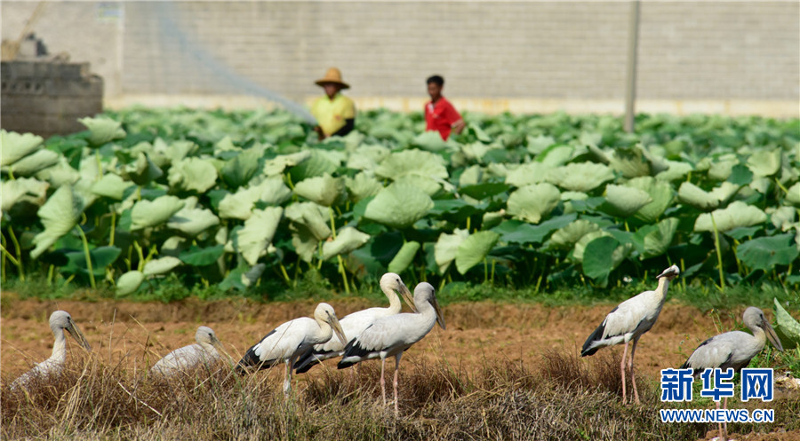 近日,云南省彌勒市竹園鎮(zhèn)農(nóng)民在荷田間勞作,不遠(yuǎn)處許多鉗嘴鸛在田邊地頭棲息覓食,一幅人鳥(niǎo)和諧的生態(tài)畫(huà)卷徐徐展開(kāi)。2006年,中國(guó)在云南大理首次記錄到鉗嘴鸛。近年來(lái),隨著生態(tài)環(huán)境不斷改善,云南多地均發(fā)現(xiàn)鉗嘴鸛。新華網(wǎng)發(fā)(普佳勇攝影報(bào)道)