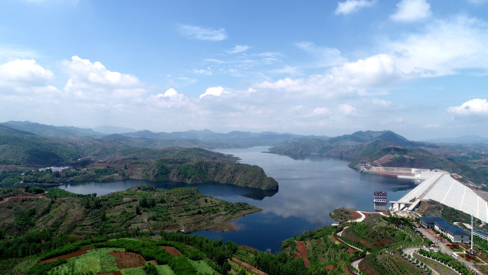 ↑位于河南省汝陽縣前坪村的前坪水庫,是一座以防洪為主,兼具供水、灌溉、發(fā)電功能的大型水利樞紐工程,是國務(wù)院確立的172項節(jié)水供水重大水利工程之一(無人機照片,4月26日攝)。