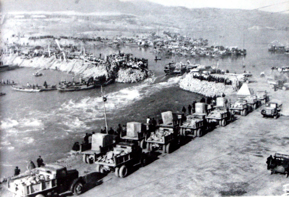 ↑1959年,丹江口大壩建設(shè)開始進行漢江截流(資料照片)。