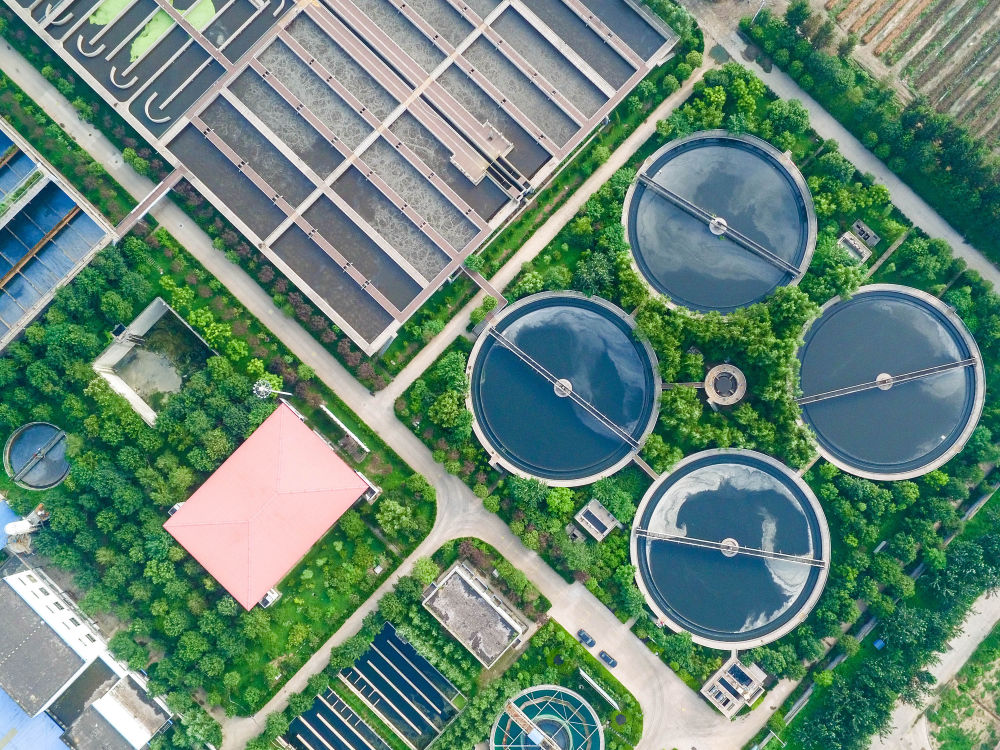 ↑在山東省鄒平縣,污水經(jīng)城市污水處理廠處理,成為當(dāng)?shù)貪竦毓珗@的水源(無人機照片,2016年7月26日攝)。