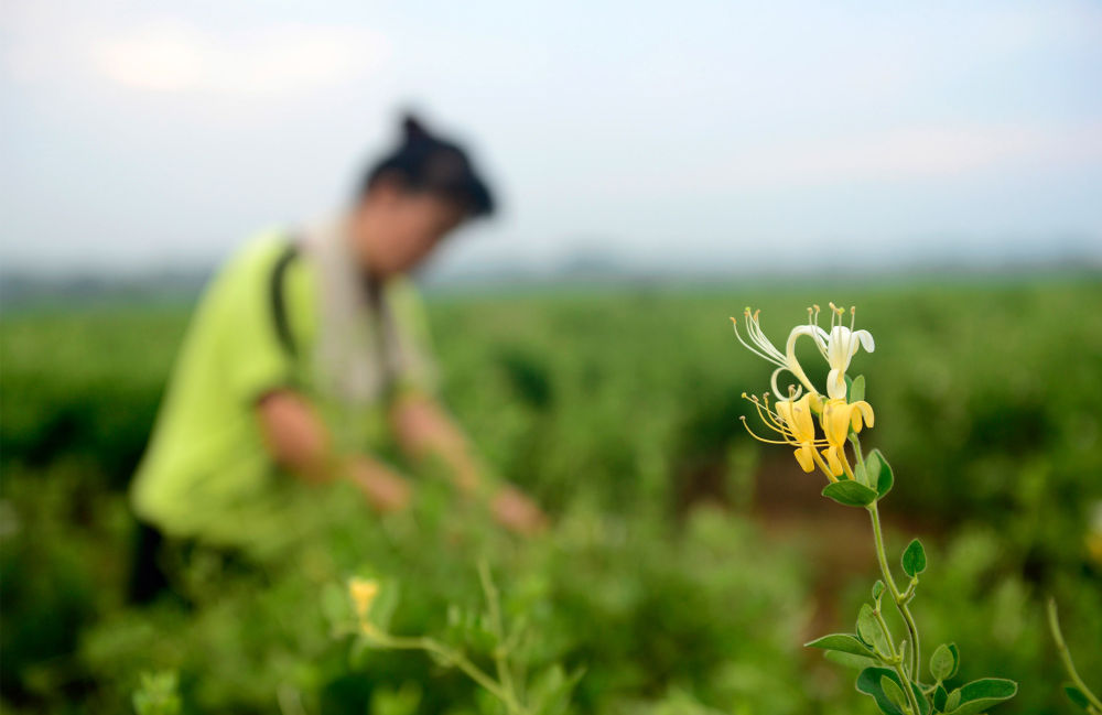 ↑農(nóng)民在河南省淅川縣九重鎮(zhèn)中藥材種植基地采摘金銀花(2016年7月30日攝)。位于南水北調(diào)中線一期工程水源地的淅川縣,通過發(fā)展金銀花、軟籽石榴、有機蔬菜等綠色生態(tài)產(chǎn)業(yè),實現(xiàn)了生態(tài)保護和百姓增收的平衡發(fā)展。