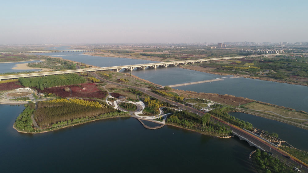 ↑南水北調(diào)生態(tài)補水,讓干涸了幾十年的石家莊母親河——滹沱河重現(xiàn)生機(無人機照片,2021年4月13日攝)。