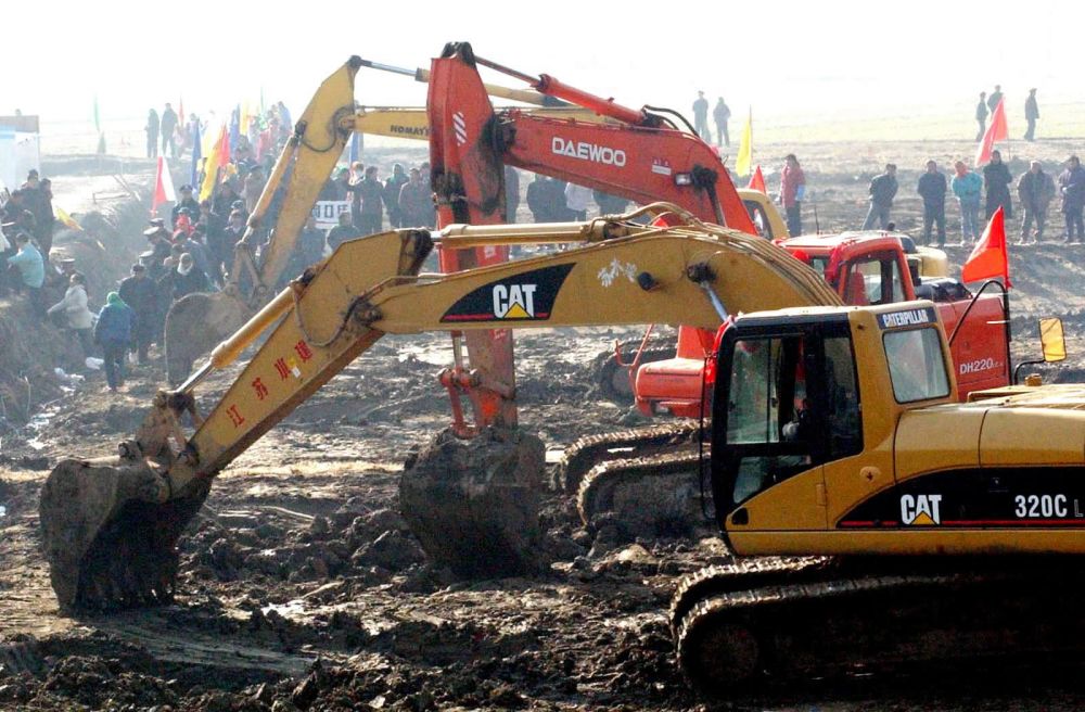 ↑2002年12月27日在江蘇揚州寶應(yīng)縣南水北調(diào)東線工程潼河工地拍攝的施工現(xiàn)場。南水北調(diào)工程在這一天正式開工建設(shè)。