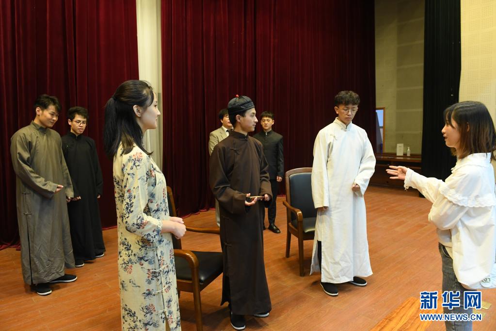 浙江嘉興學(xué)院紅船劇社的社員在學(xué)校排練話劇《初心》(2020年7月16日攝)。新華社記者 翁忻旸 攝