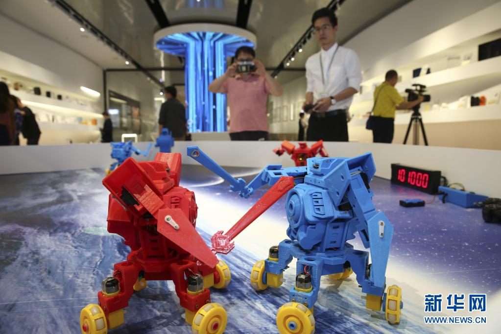 在廣東工業(yè)設(shè)計城創(chuàng)新科技館,工作人員在展示機(jī)器人“速斗無人區(qū)”(4月19日攝)。新華社記者 殷剛 攝