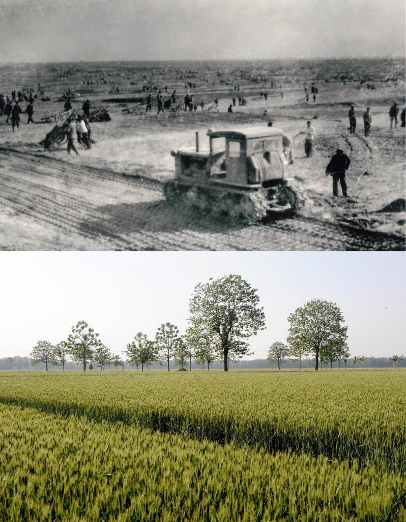 拼版照片:上圖為20世紀(jì)60年代河南省蘭考縣改造鹽堿地的情形(資料照片);下圖為蘭考縣堌陽(yáng)鎮(zhèn)的一片麥田(2014年5月5日新華社記者朱祥攝)。新華社發(fā)